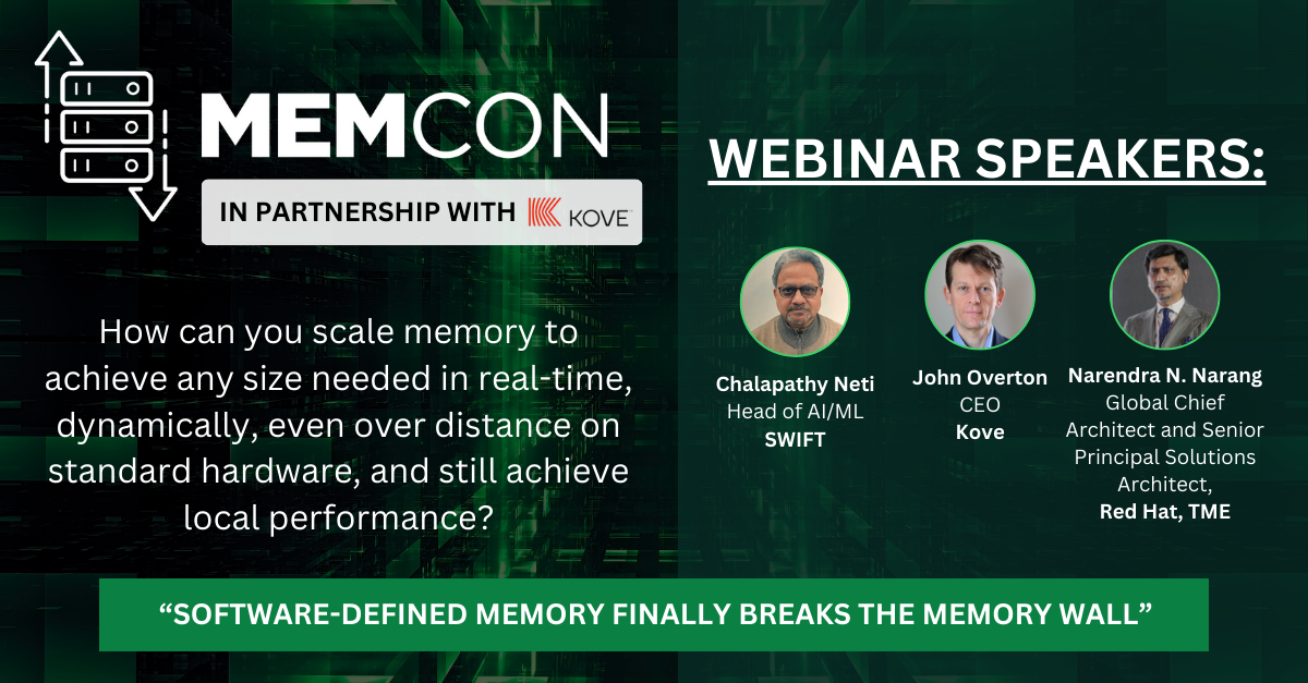 Find out in this concise, interactive webinar that delves into Kove:SDM™ – the world’s first fully mature software-defined memory solution. Red Hat’s Global Chief Architect will elaborate on the remarkable performance achieved when deploying Kove:SDM™ on Supermicro hardware with Red Hat OpenShift. Empirical findings reveal power savings from 12-54%, near-local CPU performance, and remote memory performance superior to local memory performance.